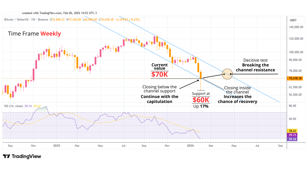 بیتکوین پس از شکست خط حمایت کانال نزولی و تست منطقه حساس 60 هزار دلاری، آماده یک آزمون تعیینکننده در بسته شدن هفتگی یکشنبه 02/08/2026 است. بسته شدن کندل هفتگی داخل محدوده کانال میتونه شانس بازگشت تکنیکال رو تقویت کنه.