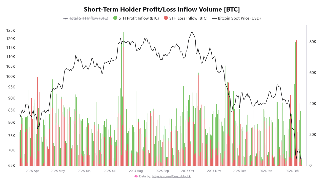 توی اوج بازار در اکتبر گذشته، هولدرهای کوتاهمدت توی هیجان بودن – اونها بیش از ۸.۳ میلیارد دلار سود رو طی یک هفته به صرافیها واریز کردن. حالا حال و هوا کاملاً عوض شده. تا اواسط فوریه، ورودیهای ضررده STH به ۳۹۹ میلیون دلار در ۱۱ فوریه رسید و بعضی روزها ۹۹ درصد واریزیهاشون زیر آب بود. این یه تسلیم کلاسیک هست، اما مبالغ دلاری در واقع کوچکتر از روز ۱.۵ میلیارد دلاری ضرر در آگوست ۲۰۲۴ هستن. ترس واقعیه، ولی شدیدش کمتر از فروشهای قبلیه.