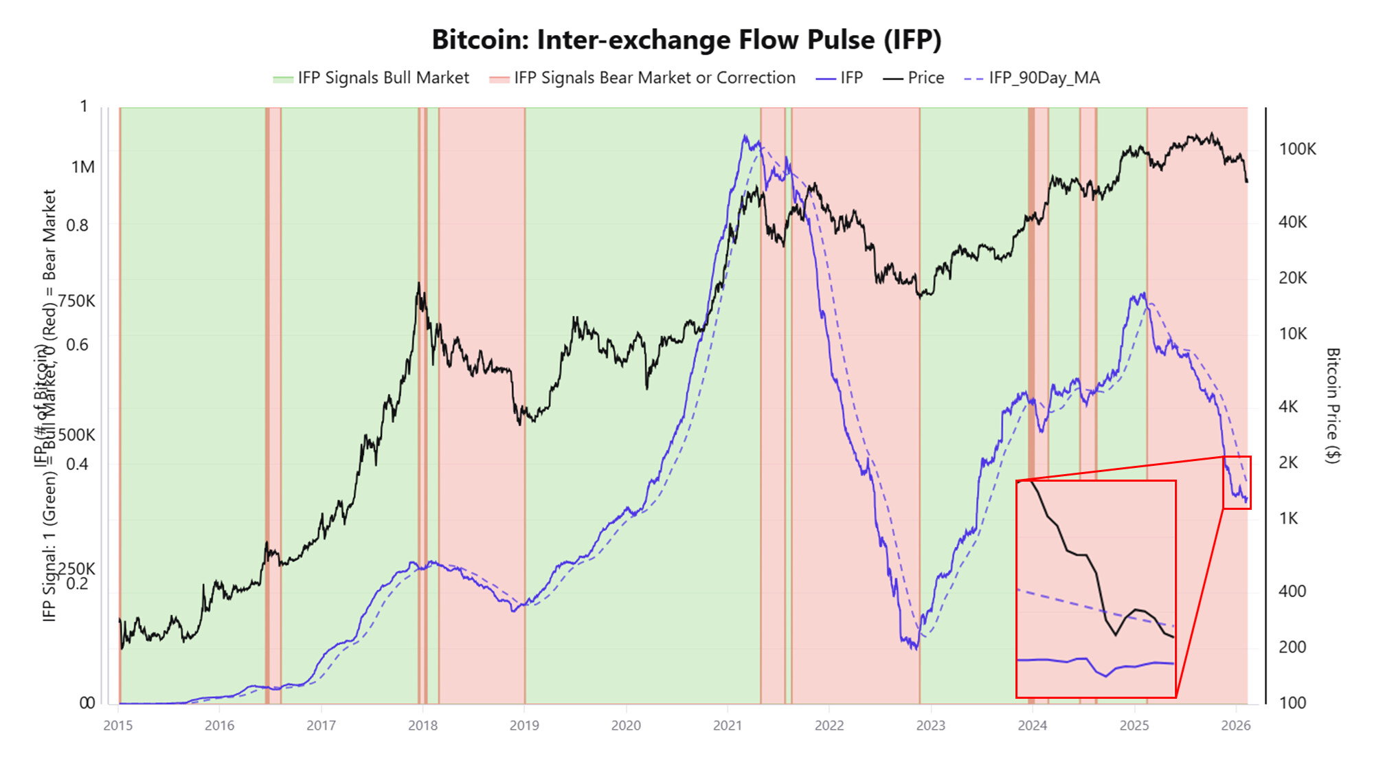 اندیکاتور IFP (Inter-exchange Flow Pulse) بیتکوین، میزان فعالیت بین صرافیها رو اندازهگیری میکنه و جریان انتقال بین صرافیهای اسپات و مشتقات رو نشون میده.