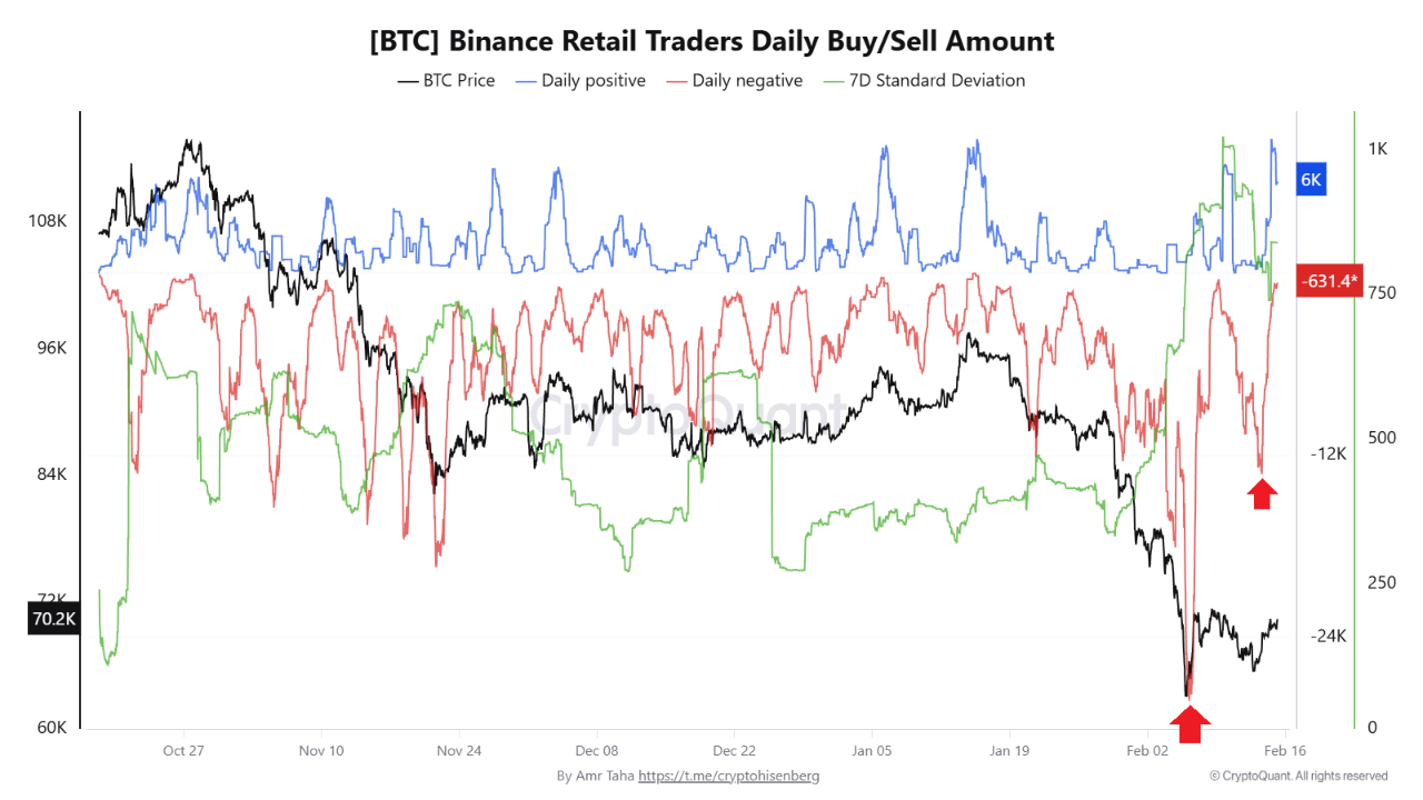 نمودار یک رویداد فروش بزرگ رو در تاریخ 6 فوریه نشون میده، جایی که فشار فروش خردهفروشان از 28,000 BTC فراتر رفت و همزمان با سقوط بیتکوین به زیر $64,000 اتفاق افتاد.