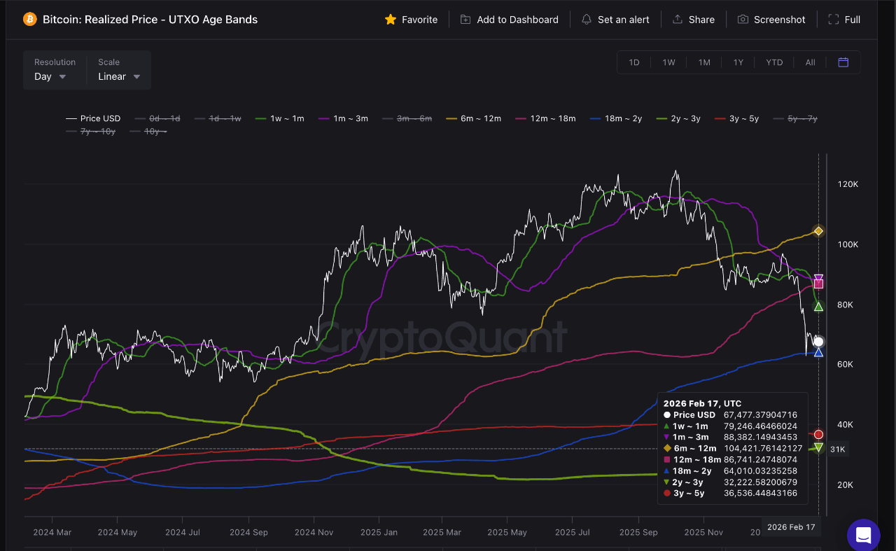 در حال حاضر، قیمت به زیر باندهای Realized Price هولدرهای کوتاهمدت (بازه ۱ هفته تا ۱ ماه و ۱ ماه تا ۳ ماه) حرکت کرده. این یعنی شرکتکنندگان کوتاهمدت به طور عمده ضرر دارن و ریزش اخیر عمدتاً توسط توزیع از این گروه هدایت شده. این ساختار همچنین توضیح میده که چرا رالیهای امیدبخش محدود میمونن، چون قیمت وقتی به Realized Price هولدرهای کوتاهمدت نزدیک میشه با عرضه مواجه میشه، جایی که خروجهای سربهسر و استاپلاسها متمرکز شدن.