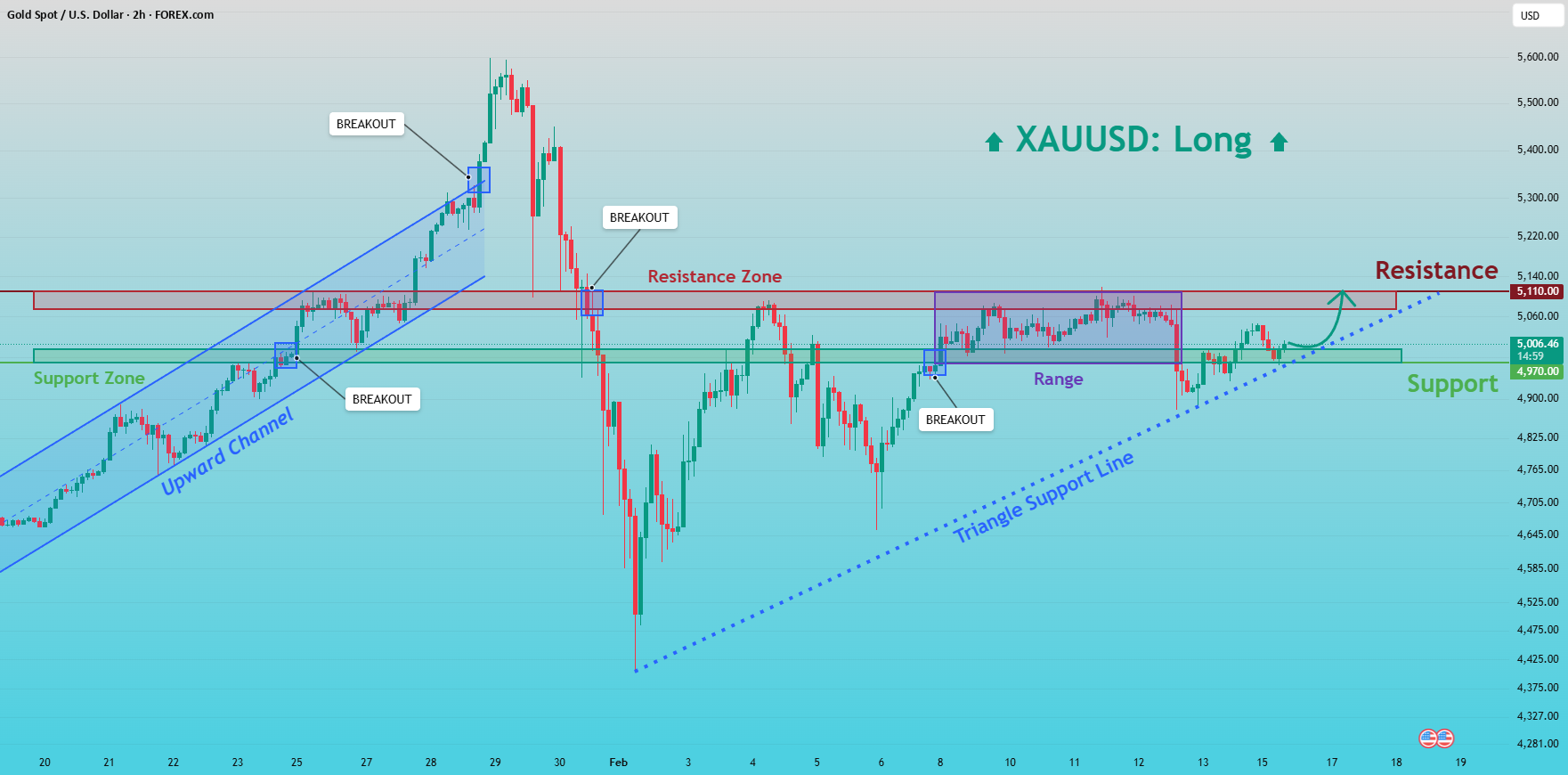 سناریو اصلی من صعودی باقی میمونه تا زمانی که طلا بالای ناحیه حمایت حدود ۵۰۰۰ بمونه و به خط حمایت صعودی احترام بذاره. کنسولیدیشن فعلی بالای حمایت بیشتر اصلاحی به نظر میرسه تا توزیعی، که احتمال ادامه رو قویتر میکنه. یک حرکت مداوم به سمت بالا میتونه قیمت رو به سمت ناحیه مقاومت کلیدی نزدیک ۵۱۱۰ (TP1) ببره، جایی که ممکنه فروشندهها دوباره واکنش نشون بدن.