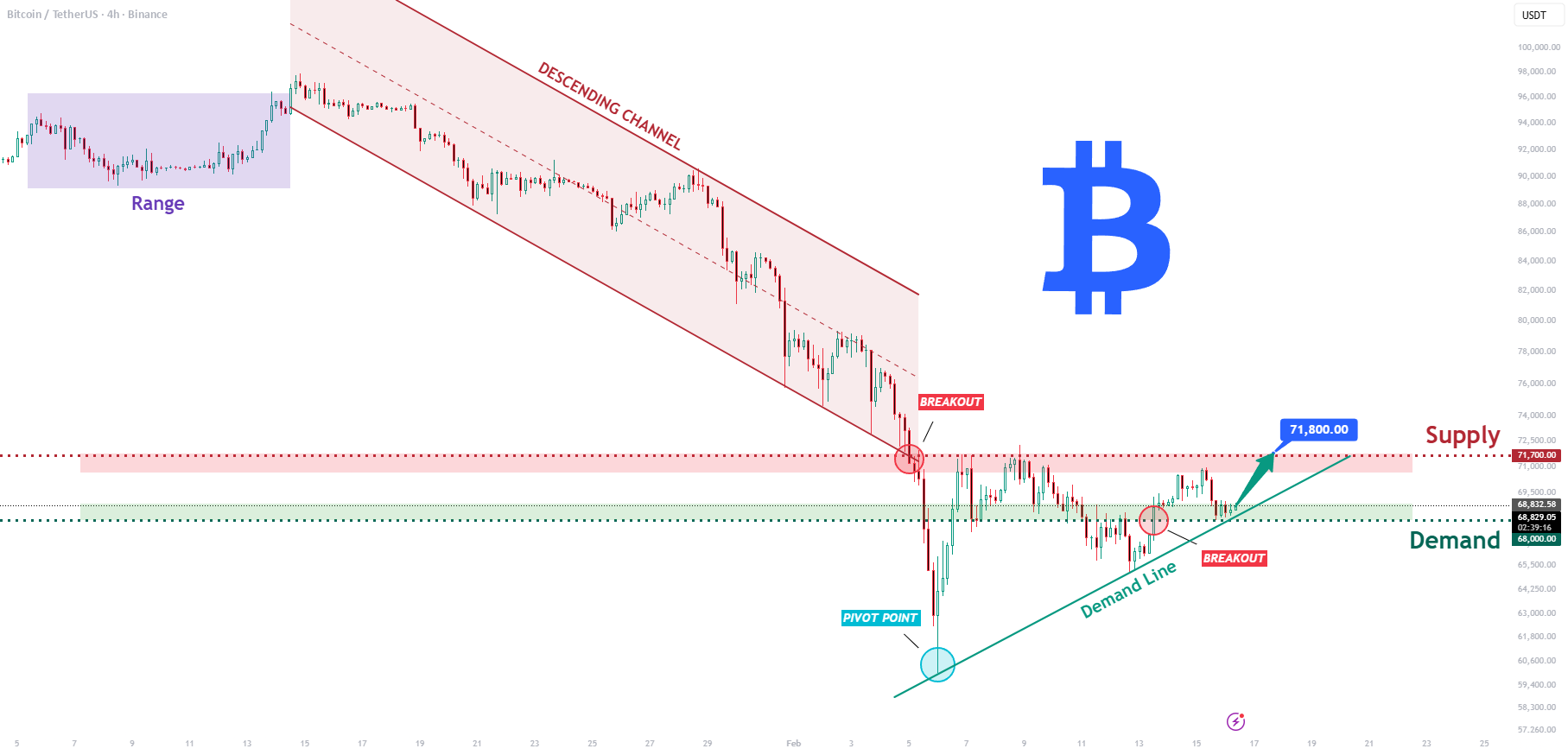 در حال حاضر، بعد از این ریباند، بیت کوین وارد یک فاز رنج خوری شده و یک محدوده افقی بین یک زون تقاضا مشخص نزدیک 68,000 دلار و یک زون عرضه حدود 71,700 تا 71,800 دلار تشکیل داده. در طول این فاز، قیمت به صورت سایدوی حرکت کرد چون خریداران سعی داشتن یک کف بسازن در حالی که فروشندهها از مقاومت بالایی دفاع میکردن.