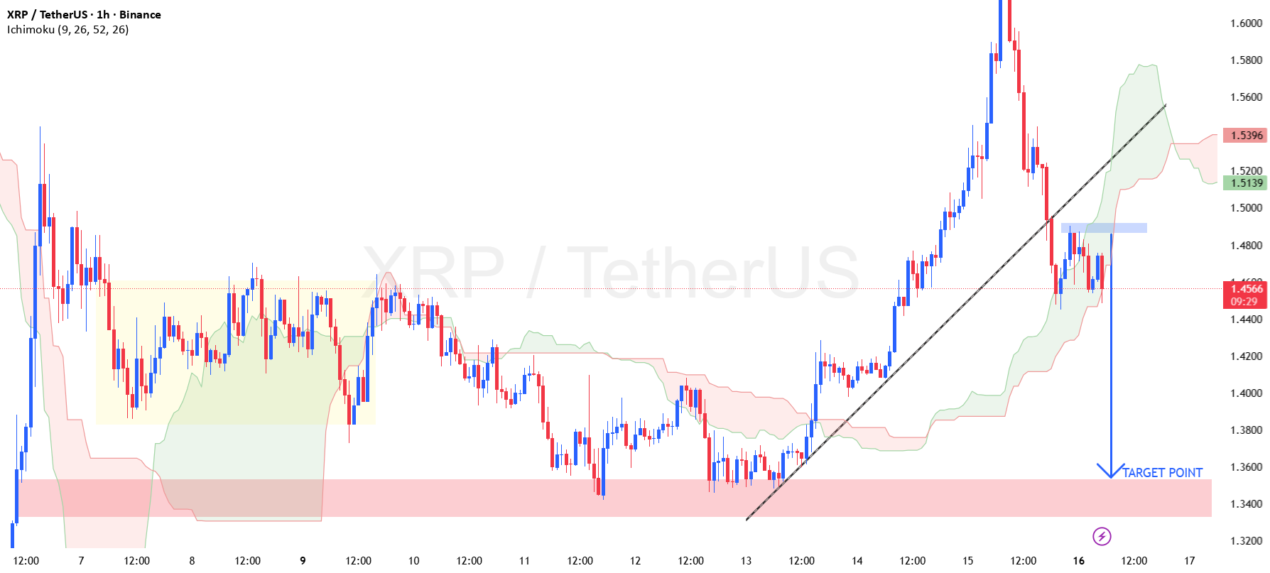 یک حرکت صعودی قدرتمند داشتیم که بعد از اون در محدوده ~۱.۶۰ دلار با واکنش شدید فروشندگان مواجه شد. قیمت ساختار کوتاهمدت رو شکست و الان پولبک هم زیر مقاومت جزئی (۱.۴۸ تا ۱.۵۰ دلار) شکست خورده. خط روند هم شکسته شده و قیمت داره به سمت پایین ابر ایچیموکو حرکت میکنه.
