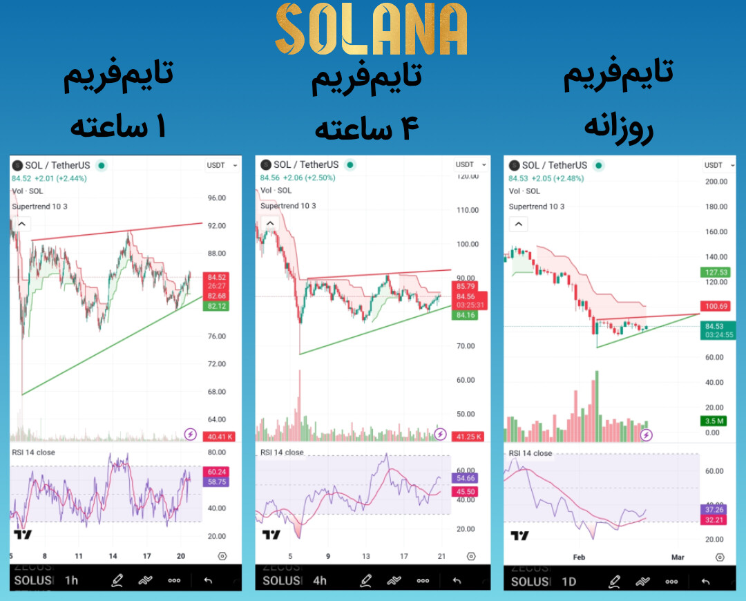 با یه نگاه به سه چارت در تایمفریمهای ۱ ساعته، ۴ ساعته و روزانه SOL/USDT متوجه میشیم که همهشون یک الگوی مشابه دارن: