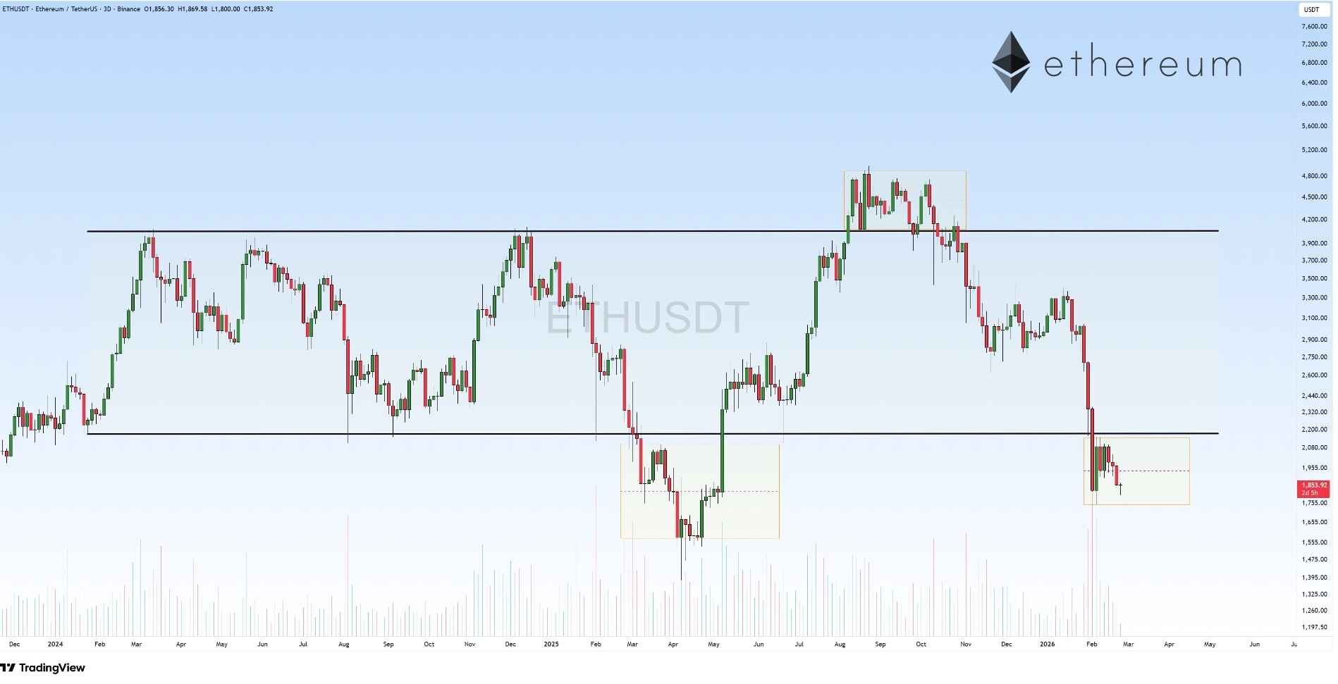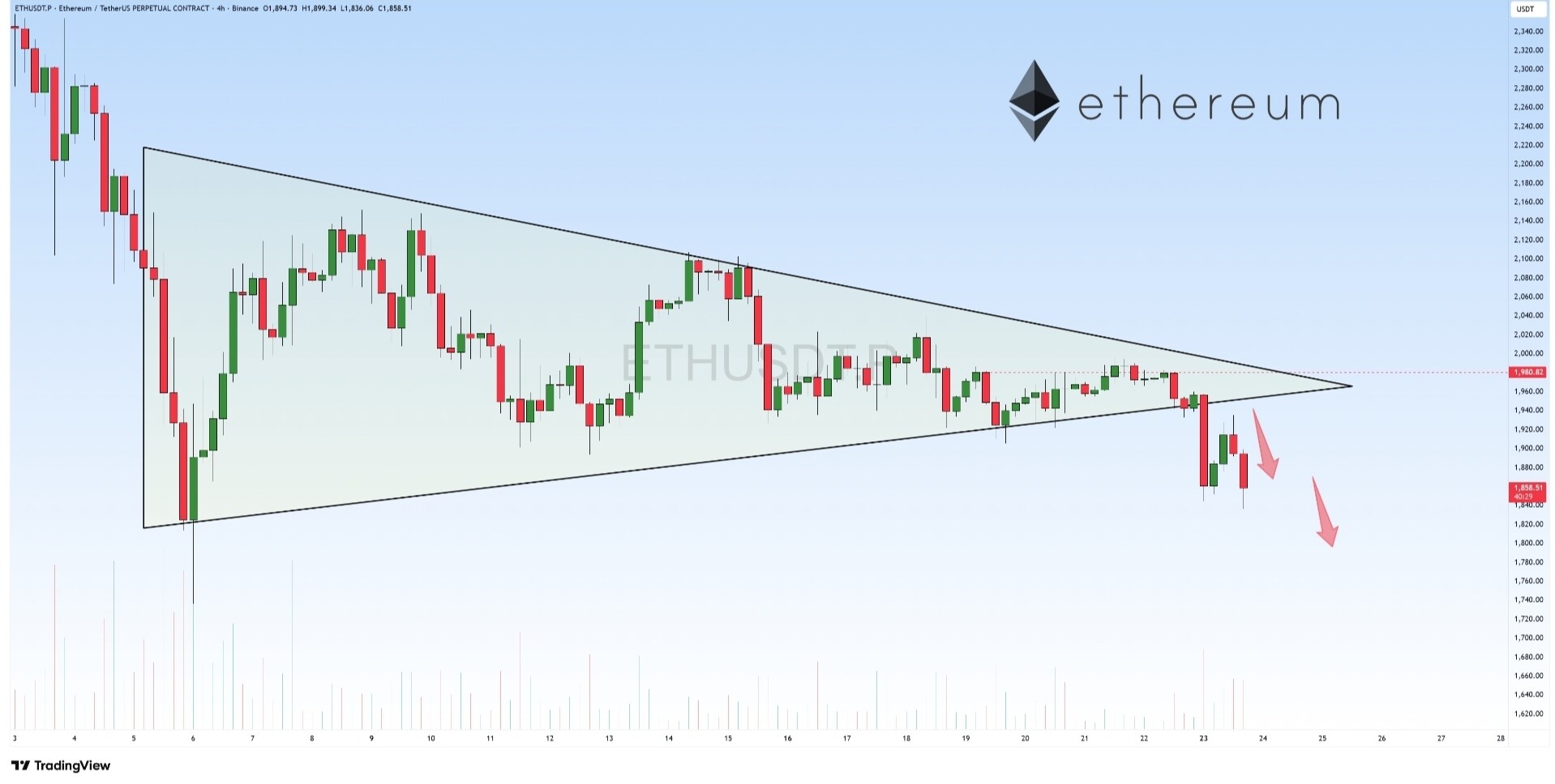 در بازه زمانی ۳ روزۀ اتریوم، بعد از چنین افت بزرگی از بالا، دنبالکردن روند نزولی در اینجا جذاب به نظر نمیرسه. قیمت هنوز هم میتونه پایینتر بره، چون متأسفانه خط روند حمایتی و مثلث رو در تایم فریم ۴ ساعته شکسته، اما فعلاً بهتره صبر کنیم و ببینم آیا اتریوم میتونه به محدوده مثلث و بالای خط روند حمایتی خودش برگرده و تثبیت بده یا نه؟!