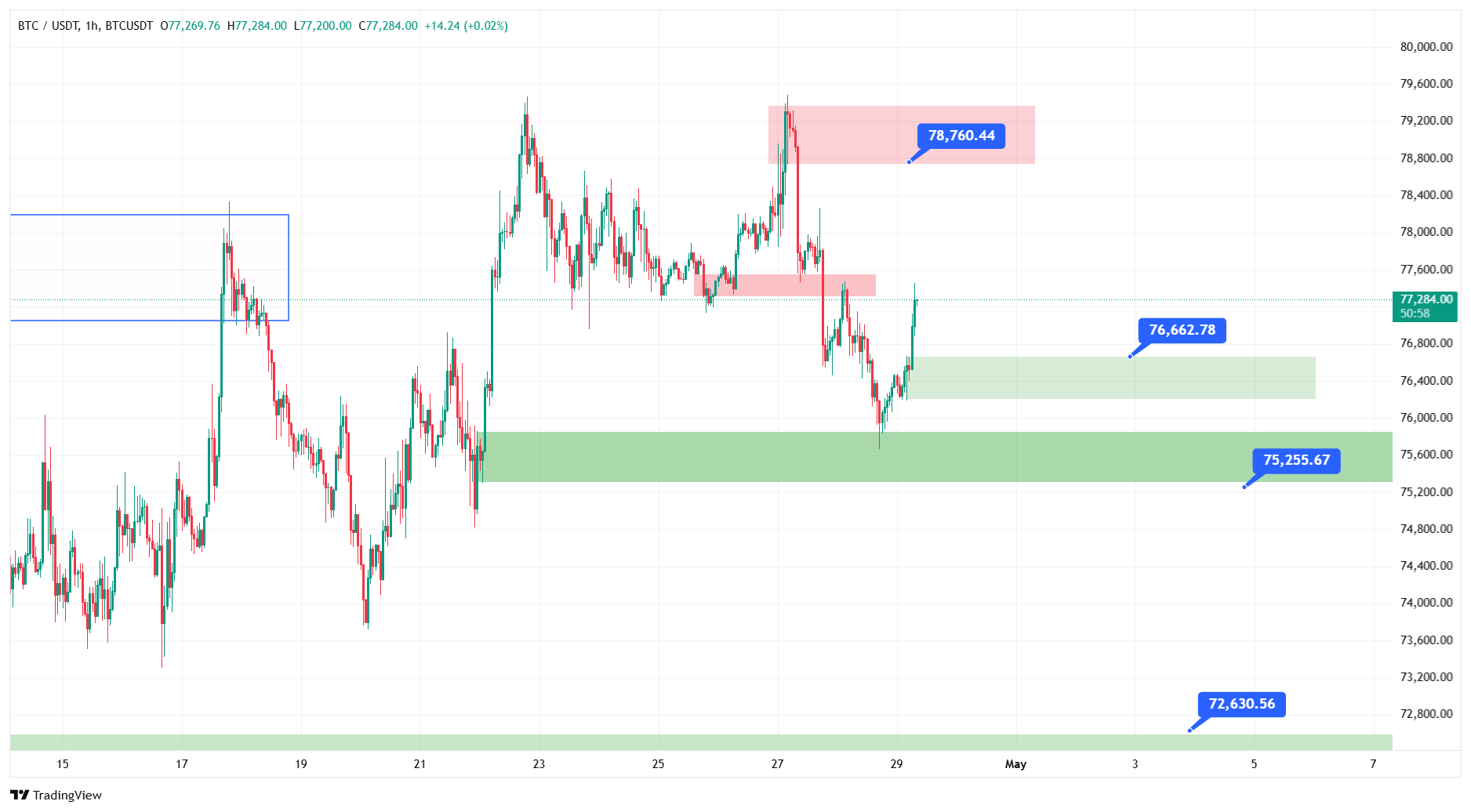 در حال حاضر بیت کوین به ناحیه مهم 77300 رسیده و امکان اصلاح تا باکس 76600 وجود دارد. روند صعودی میتواند حداقل تا باکس قرمز 78800 ادامه داشته باشد.
